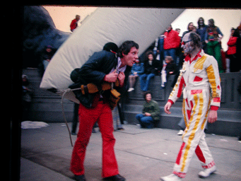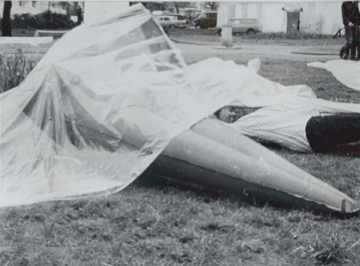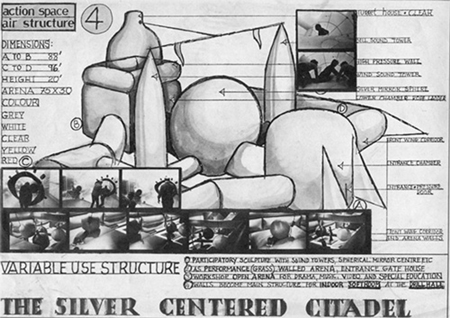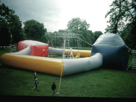 The Action Space that we developed was a programme to initiate the practice of performance, music and dance in order to bring a sense of drama into large scale structured environmental events. These disciplines were integrated into the physicality of the structures as stories and narratives, woven as if into the membrane of surfaces and the structural function of air as it pulsated, alive and breathing and circulating throughout the heaving sculptural body. (photos) Thus in themselves, the drama intensified the atmosphere and mood of the instant built/blown environment of the air structures. We as artists and operators took on roles or characters to play out dramas that nowadays are named as Durational Performance Art. Almost an accidental development because we had need of a defence mechanism, a kind of ‘accident’ in art to defend ourselves working with air structures and defence of the structures themselves. Because they were vulnerable to knife attacks we had to become characters larger than life as a form of security. We were I think, in 1969, a pointer to the practice of Performance Art of the 80’s. Action Space archives, which are quite extensive in film, photos and reports, exist as evidence of this practice. (see photos)
