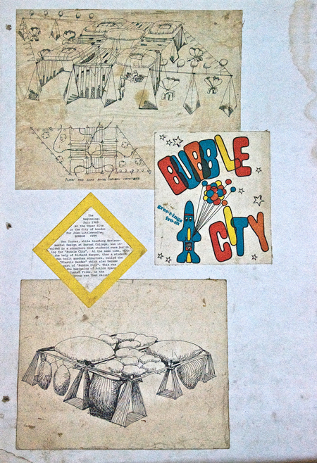 “We could only see that parts were beginning to fit together in a new way: we had to feel intuitively that things were right; there’s no grand master plan to work to. It often happens by accident or force of circumstance, which I think is sometimes exactly that, accidental”. John Willet, the authority on Brecht, whom we met through Berger also wrote in this issue, was later to become one of our Trustees. A.S. Neill, the free school pioneer who founded Summerhill in Suffolk, agreed to being our Patron at around the same time. Somehow things were building up but we had no idea what might come to fruition as new art, though we knew something or other was possible, it had to be, and by the time of the quote above it had become near to being a possibility. The only way to go forward was to match theory with action as immediately as we could, a kind of action research, as it were. From this time on in 1968’s “Bubble City”, when the Garden was in its full 600 square feet of operation, with music and performance and public engagement, a loftier idea as indicated in the above remarks, was forming in my mind. The demountable nature of the structure with its wooden pyramidal uprights and collapsible benches, supporting an inflatable ceiling was strong and functional enough to be suggesting working towards a greater and larger structure that was entirely inflated, instantly and anywhere, in both urban and countryside environments. This would be made possible by the development of new flexible sheet plastics re-enforced with nylon net and blown up by powerful centrifugal blowers, the Garden, incidentally, had used vacuum cleaners! My research into ‘plastics’ was proving itself with the use of re-enforced Polyvinyl Acetate in flexible sheet (Underlay of drawing and chemical structure of plastics, also geometric drawing of air structures) becoming a boon to environmental artists and performers in public spaces throughout the UK. Maurice Agis and Peter Jones were also practitioners and researchers in this art form, Jeff Shaw, and Graham Stevens, architects, were all also active in new ways of being artists/architects of the future.