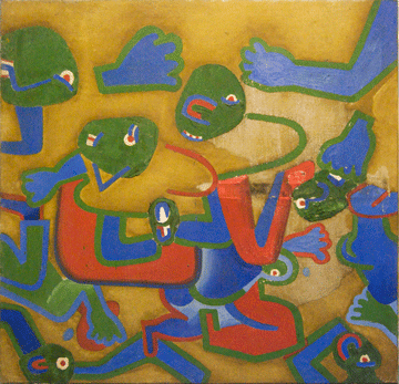 We had some understanding that a dramatic beginning was necessary. Roddy Maud-Roxby, an actor from The Drama Machine, entered the Gardens at a dramatic distance from where we all were, approaching very slowly with masked face, taking the kids by surprise; Roddy had an immense sense of that real dramatic quality of presence; the mask added just that amount of mystery in the clear still morning. From then on it seemed that their attention was caught, and we starting devising many ways of creatively engaging them in theatre games and creative actions and painting. Thankfully our research into drama and theatre worked to some good effect, and Anne Martin, a lecturer and painter, from the Central School, where I was also teaching, set up a painting section that through the days ahead proved a haven for expression about the activity and experience of those taking part, most often with remarkable images relating to the spirit of the days events.
