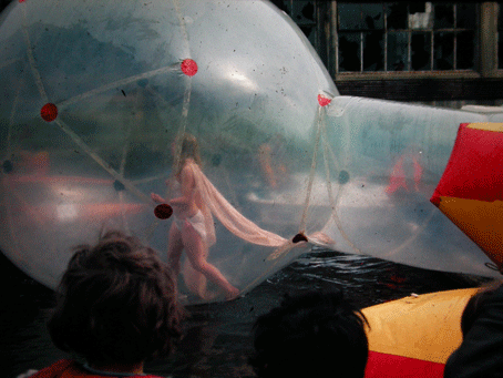 Paula Saul with physical movement relating to the inflatables. The People show making their entrance dramatically.