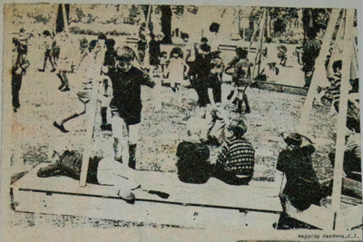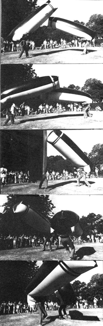 The design of Wapping Gardens wasn’t anything to shout about, but we managed to find a large enough space to begin. Our structures of wooden benches and pyramidal uprights from “Bubble City”, now funded by a £300 grant from the Arts Council enabled me to expand on the design to form an arena for action. A lot of kids and mothers turned up, we had advertised ourselves to the immediate community; they were expectant of something strange happening. (photos). Alan Nisbet, of Combat Films, was taking the photos.