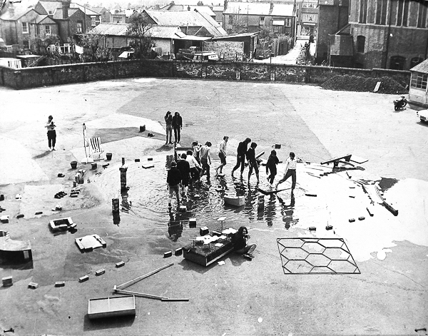 The mothers came to see what we would be providing for their kids, who were aged 4 to something like 16-17, and I guess where expecting a familiar play scheme set up, but they might have had a clue about it being different because we had advertised our coming as artists. The older youths to some extent thought it advisable to stay to one side, until we presented more dangerous things to do. The dangerous events were bouncing off half inflated ‘air beds’, or testing what height they could bounce. The air- beds, or cushions as they called them, were in constant use and often were seen being carried out of the graveyard, stealthily being moved down the street, as though we couldn’t see these brightly coloured objects. To my surprise they could be stopped by my loud commanding voice, just like that, amazing! Again my thoughts pondered on why an artist thought this was a necessary function, but later realizing this was a self imposed training. Coming out of events as they came into being, it was as if training was now inevitably bound up with the project experience; eventually recognizing its purpose and place in our development of how to proceed with performance. A sense of something real and a sense of excitement in ‘pioneering’ an unknown territory of performance: new, real and practical, there could be no stopping, despite the surprises in store or the dangers ahead, or the learning we had to do.