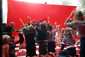 Our children benefited from our activities from a long way back, though not with the First Group. But were, from the first playgroup events initiated into the experience of large inflatables for rolling and jumping on. As they grew up, Action Space members became, in a sense their larger family. Finally leading them to become performers and innovators themselves: in a sense, a varied, stimulating and creative educational slice of life in the process of growing up. Theodora is now running her own organisation in creative play with Tepee in South Devon, based on ideas of creative play, and Jason is acting and directing whilst teaching at the Jacques La Coque Theatre School in Paris. So something must have rubbed off in their education through art and performance. At one time Jason aged 6 was almost taken to the casualty section of Rotterdam hospital for acting ‘dead’ too convincingly and Theodora aged 8, in acting the part of Alice became a star in the eyes of local children. Performers and musicians who eventually came to work in the group, as it grew in size, spoke about the freedom it gave them from academic rules to find in themselves a new discipline; a sense of relief in that they were ‘allowed’ to experiment and explore territories foreign to their normal practice learnt in academies and universities: three graduates came from a newly set up interdisciplinary course from the Central School of Art and Design, they felt immediately at home and made significant contributions to the group.