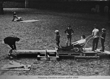 Next, I will describe what happened in Wapping 1969, Action Space’s first real project. Maybe we could achieve some of the above quote from Cedric Price. I think we believed that this could be an objective. WAPPING LONDON E1 - 1969 and 1970 - A TWO WEEK RESIDENCY On the occasion of two consecutive summers Wapping, a run down area, untouched by development well into the 1980’s, was surrounded by docks, later to be filled in by the London Docklands Development Board, could be approached by a bridge from the Highway. The other entrance was from the east over another bridge; bridges that fed into the docks with the Thames running along one side. For Action Space it was like an island ignored by the Greater London Council with an odour of cinnamon and other spices coming from the warehouses, some still functioning, trading in paper and other goods. But the docks themselves were like wastewater, untouched, idle and unused. The weather though, surprisingly, was always bright and sunny. Was it the presence of the river, we wondered? It seemed so cut off and strange. I think we were surprised that English was even spoken.